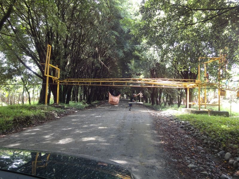 En quittant Cano Blanco nous "tombons" sur un passage à niveau de bananes. Oui vous avez bien lu ! Les routes au sein des plantations sont pourvues de barrières qui se ferment lors du passages des régimes souvent accompagnés des hommes suspendus avec les bananes. L'ensemble est tracté par un moteur sur cable. Cela circule comme un train. C'est un spectacle surprenant et amusant. La circulation des véhicules est interrompue pour laisser passer le convoi de bananes. C'est beau le modernisme !