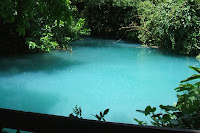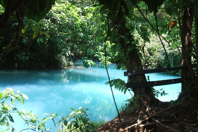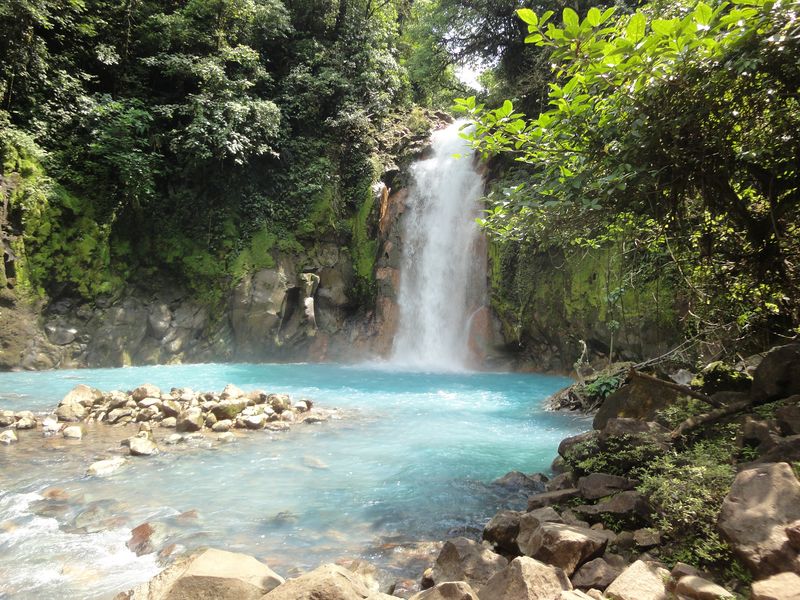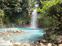 Au terme de la nuit passée à Bijagua, nous allons sur les pentes du volcan Ténorio et entrons dans le parc national après 30 minutes de piste caillouteuse affligeante depuis le village. Nous effectuons un parcours pédestre de quatre heures à la découverte d'une superbe cascade bleue azur, d'un lac naturel d'un bleu merveilleux, et nous terminons par une baignade dans les eaux thermales et sulfureuses naturelles au sein des roches du rio céleste qui les borde. Nous pouvons ainsi alterner chaud et froid car ces eaux sont à 36/37 degrés pour les thermes et 16/17 pour le rio, un vrai plaisir ! Nous nous détendons !
