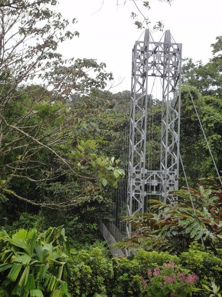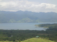 Dans l'immédiat, nous poursuivons jsuqu'au lac Arenal, immense masse d'eau de couleur verte qui le caractérise. Une épaisse jungle cerne le lac. Sur la route nous sommes mis en présence de gentils Coatis ( entre singe et raton laveur ) qui s'approchent de nous. Mignon petit animal à la mine sympathique. Quelques clichés ! La journée se termine en parcourant un pont suspendu de 100 m de long à 40 m du sol ! Un peu impressionnnant, il faut le dire. Le stage commando est loin !