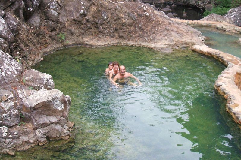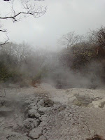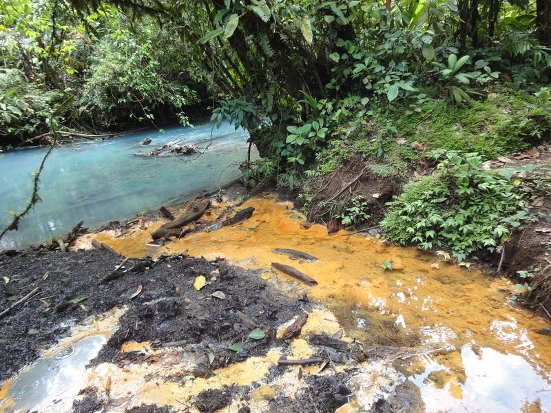 Nous notons durant la promenade que des ruisseaux d'eau sulfureuse bien jaunâtre se jette dans le rio. Il apparaît un superbe contraste de couleurs entre le bleu et le jaune. En fait, nous apprenons le bleu est obtenu par l'effet du gaz du volcan qui remonte dans l'eau.