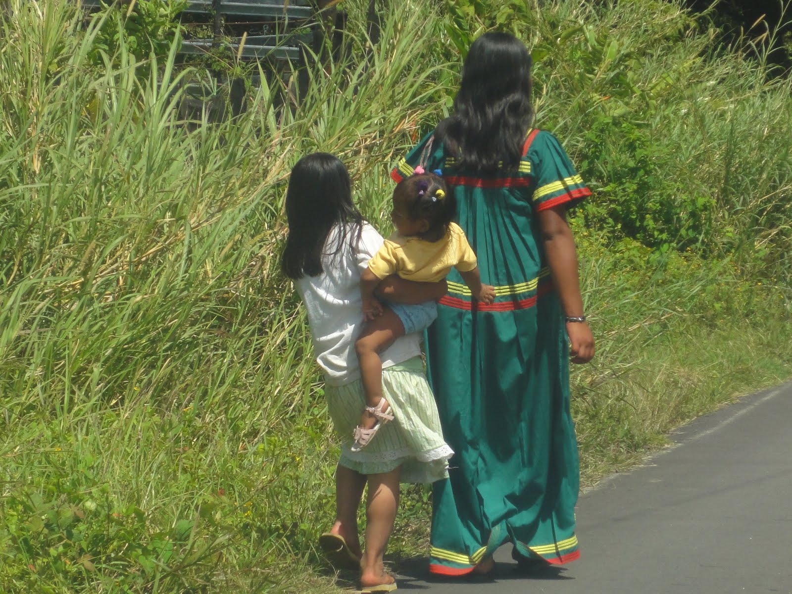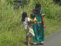 Nous reconnaissons les environs en voiture et montons à 1500 m au sein d'un parc naturel où vivent les quetzals – oiseau bleu -. Chantal en apercevra un. Nous rencontrons un air frais qui nous change de la chaleur étouffante de David. A la croisée des chemins, des paysans qui rentrent des champs munis de leurs pioches pour certaines en fer d'autre en bois. Pas de dimanche pour eux. Les femmes sont très souvent en tenues traditionnelles, de longues robes de couleurs vives, souvent au ton unique ( bleu, rouge, rose ).