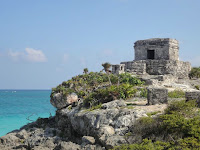 Matinée farniente sur la plage et hop fin d'après-midi nous partons en taxi pour la visite des ruines de Tulum à 5 kms au nord, le seul vestige maya en bord de mer.